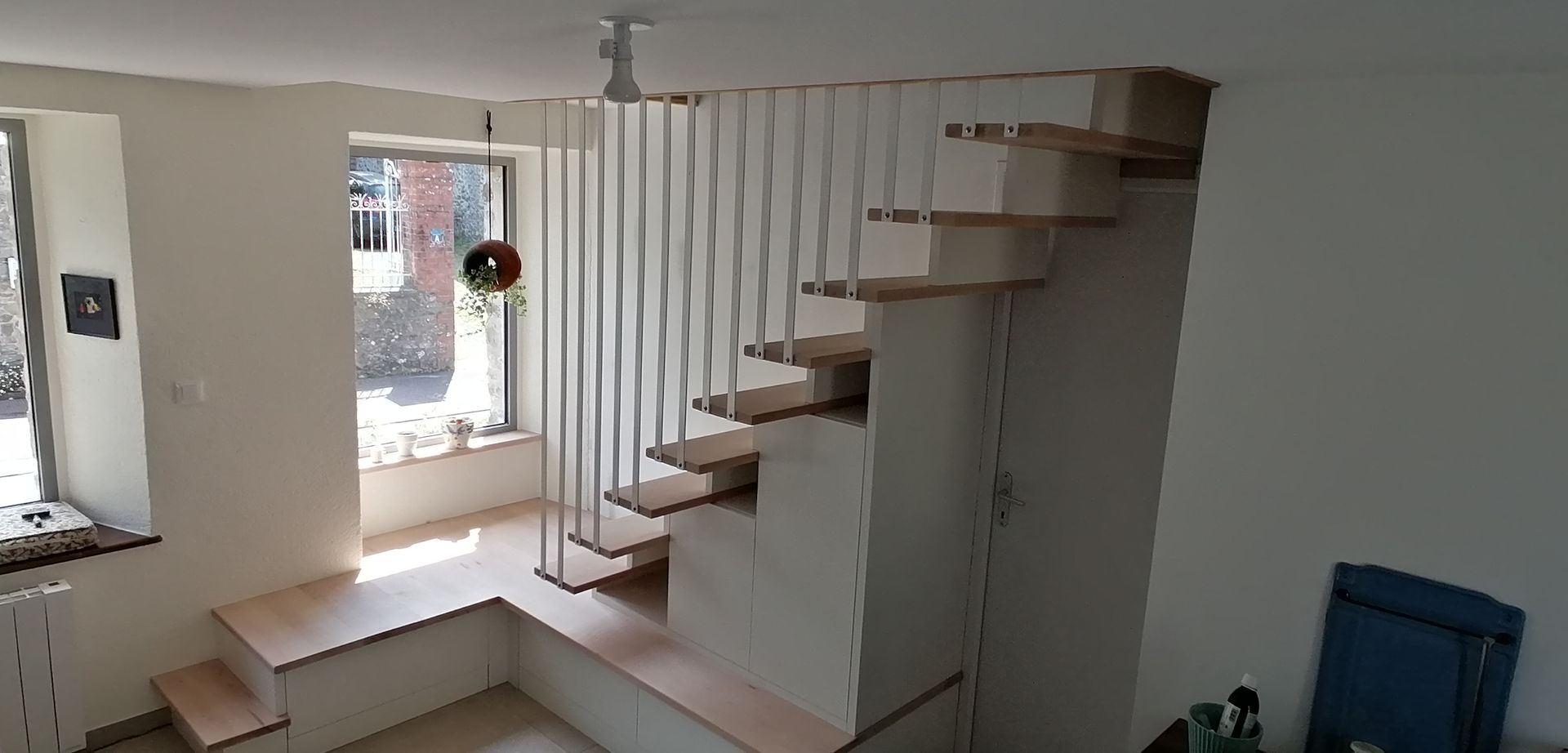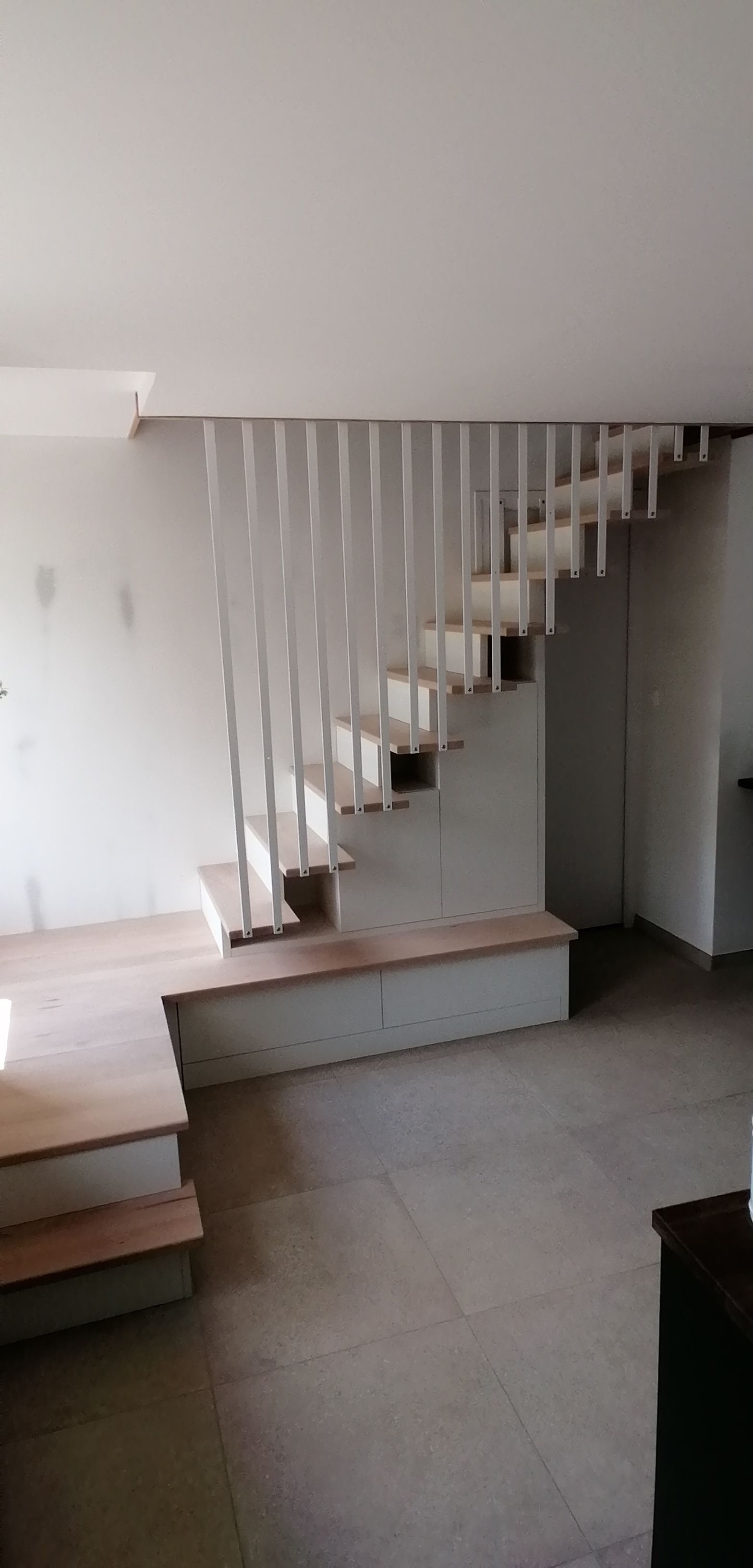 Vous gagnez des étagères, des placards, des tiroirs intégrés et tous autres types de rangements à un escalier.